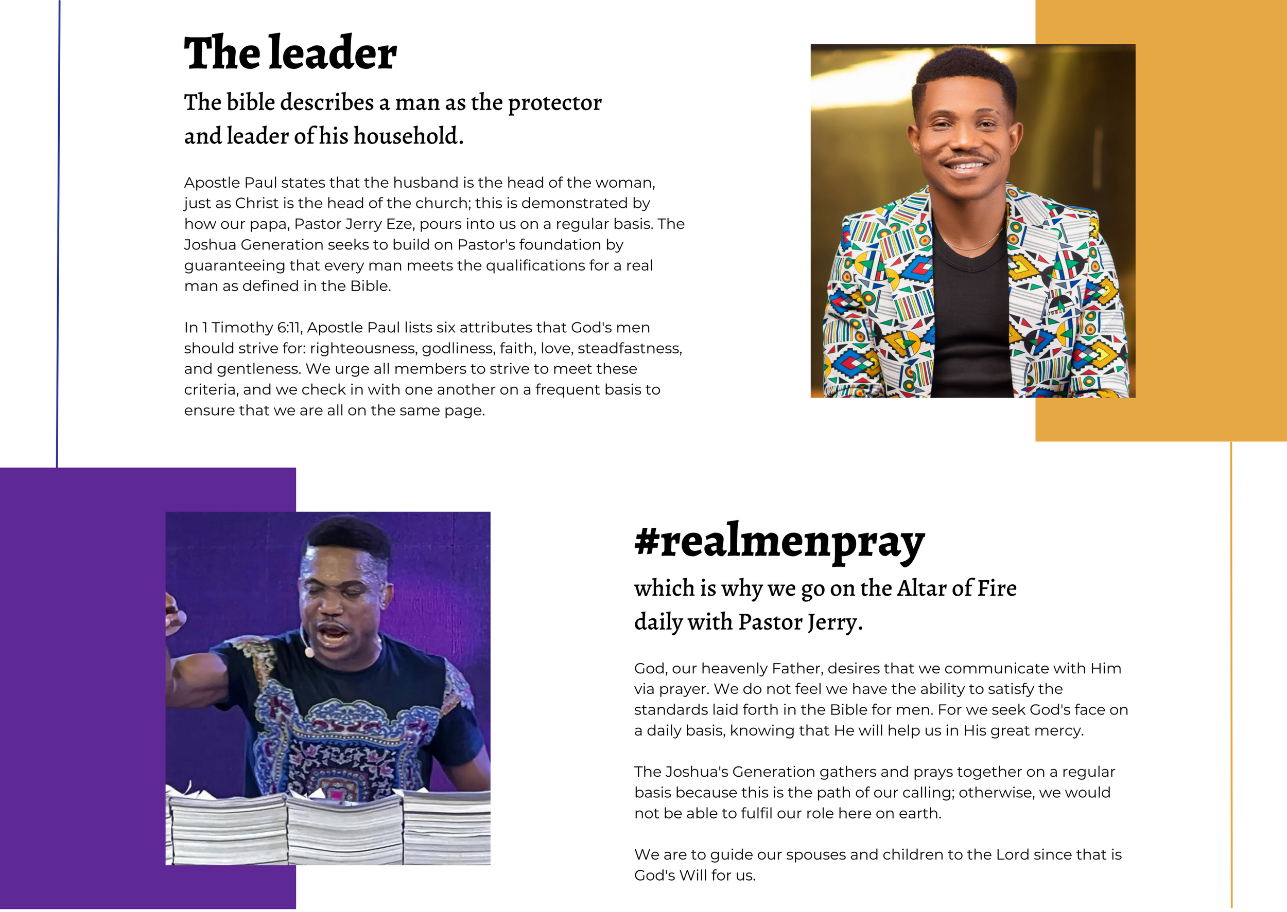 The Joshua’s generation is a group of men of integrity committed to God’s work, growing in Christ, and empowering one another to become Christ-like leaders at home, in Church and the community.