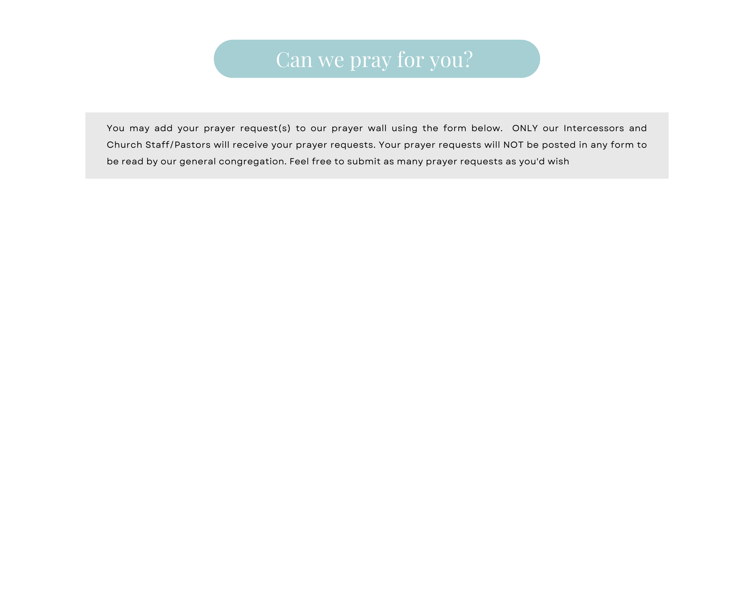 You may add your prayer request(s) to our prayer wall using the form below. ONLY our Intercessors and Church Staff/Pastors will receive your prayer requests. Your prayer requests will NOT be posted in any form to be read by our general congregation. Feel free to submit as many prayer requests as you'd wish.
