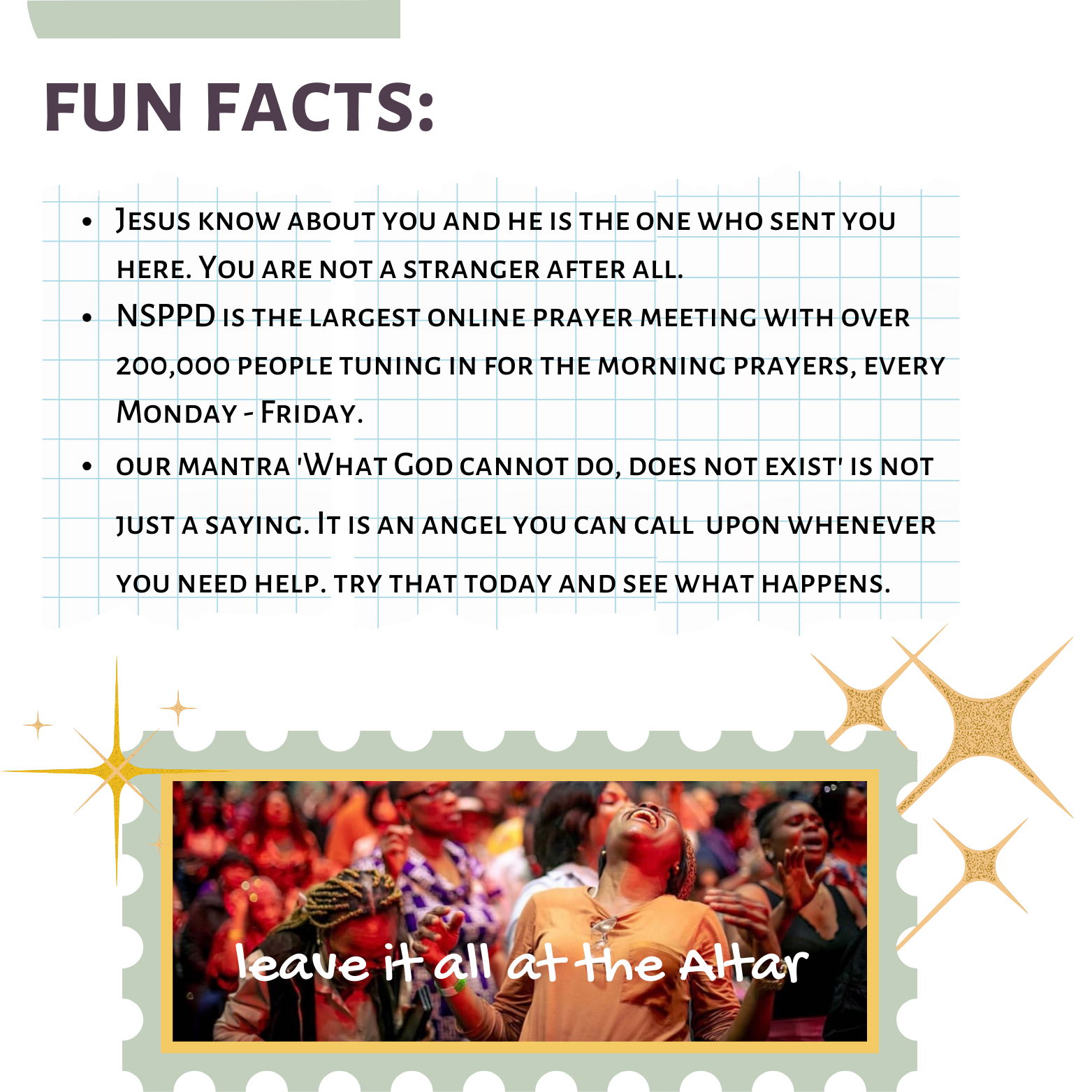 NSPPD Morning Prayers, established in 2020 by our General Overseer Pastor Jerry Eze, unites us and many others throughout the world to the Altar of Fire. Join us every Monday through Friday at 7 a.m. BST on all of our Social Media platforms to yell down the injustices of the world and take our rightful place.